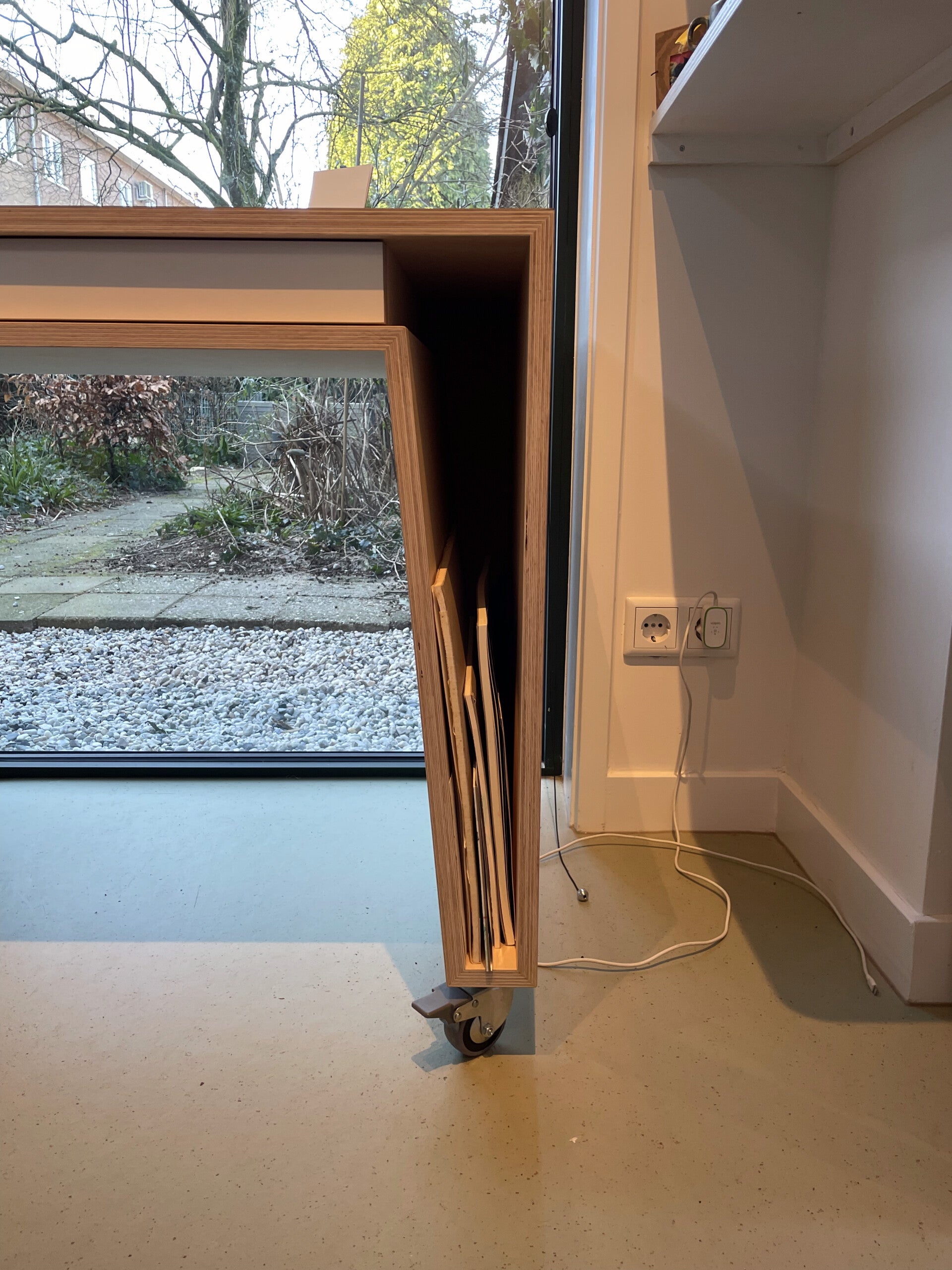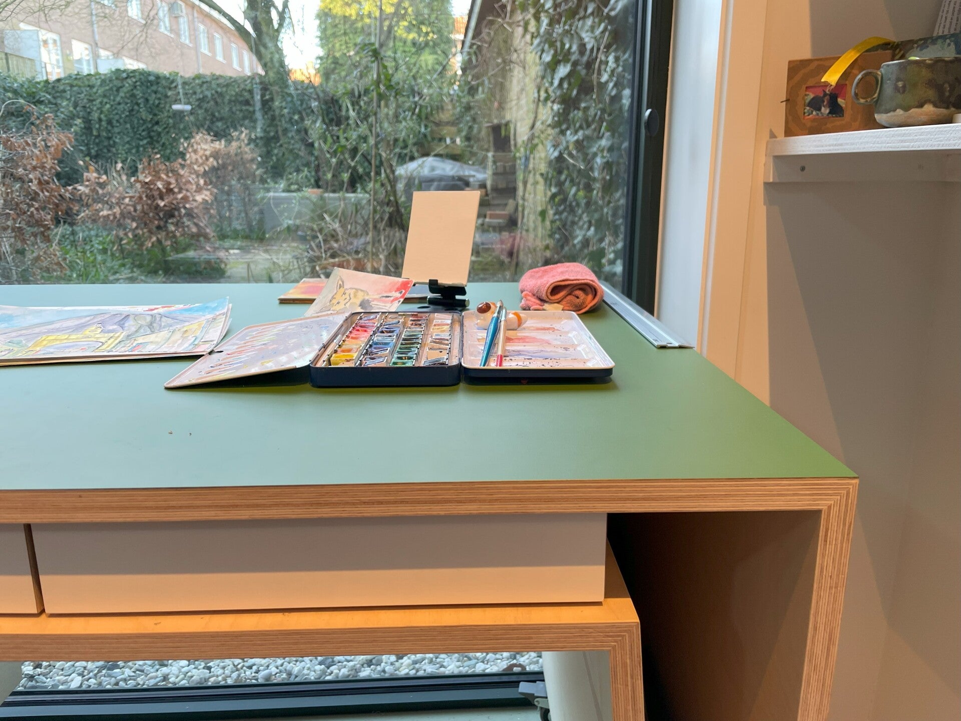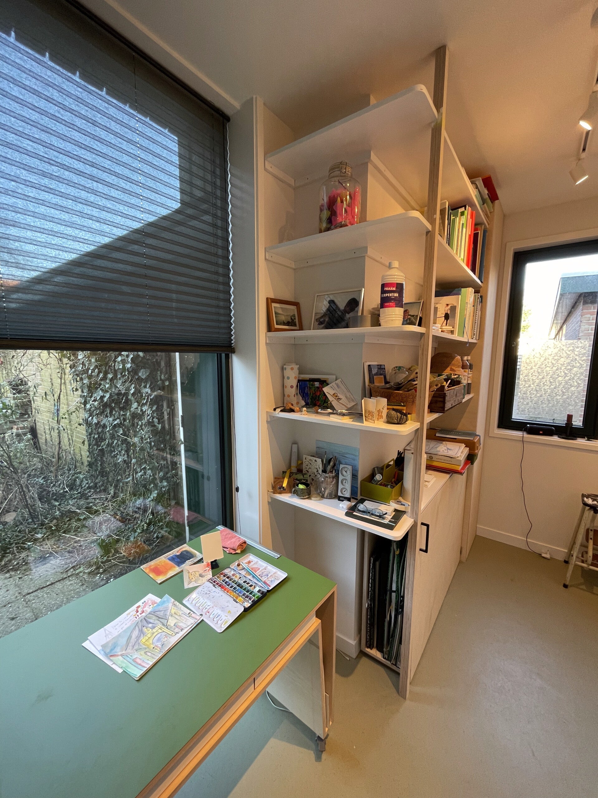 Voor een nieuw atelier ontwierp ik een verrijdbaar bureau en een slimme wandkast, beide in licht berken multiplex, het bureau met een groene HPL toplaag. Het bureau heeft doorlopende lijnen, geïntegreerde lades en open poten voor opbergruimte. De kast bevat een scharnierend deel voor tekenmappen dat ook als aflegplek dient. Zo ontstond een functionele én originele werkplek die mooi aansluit bij de tuin.