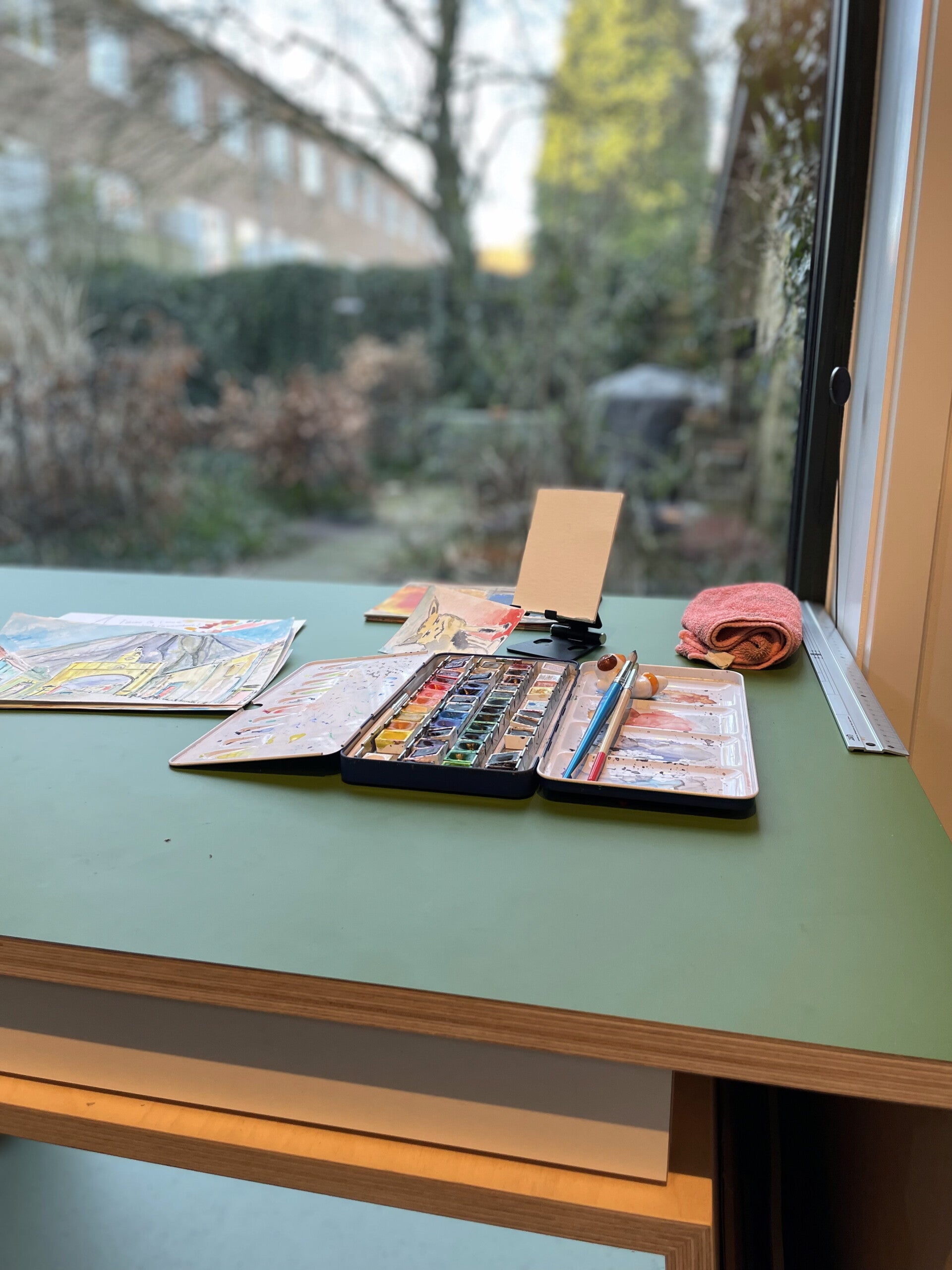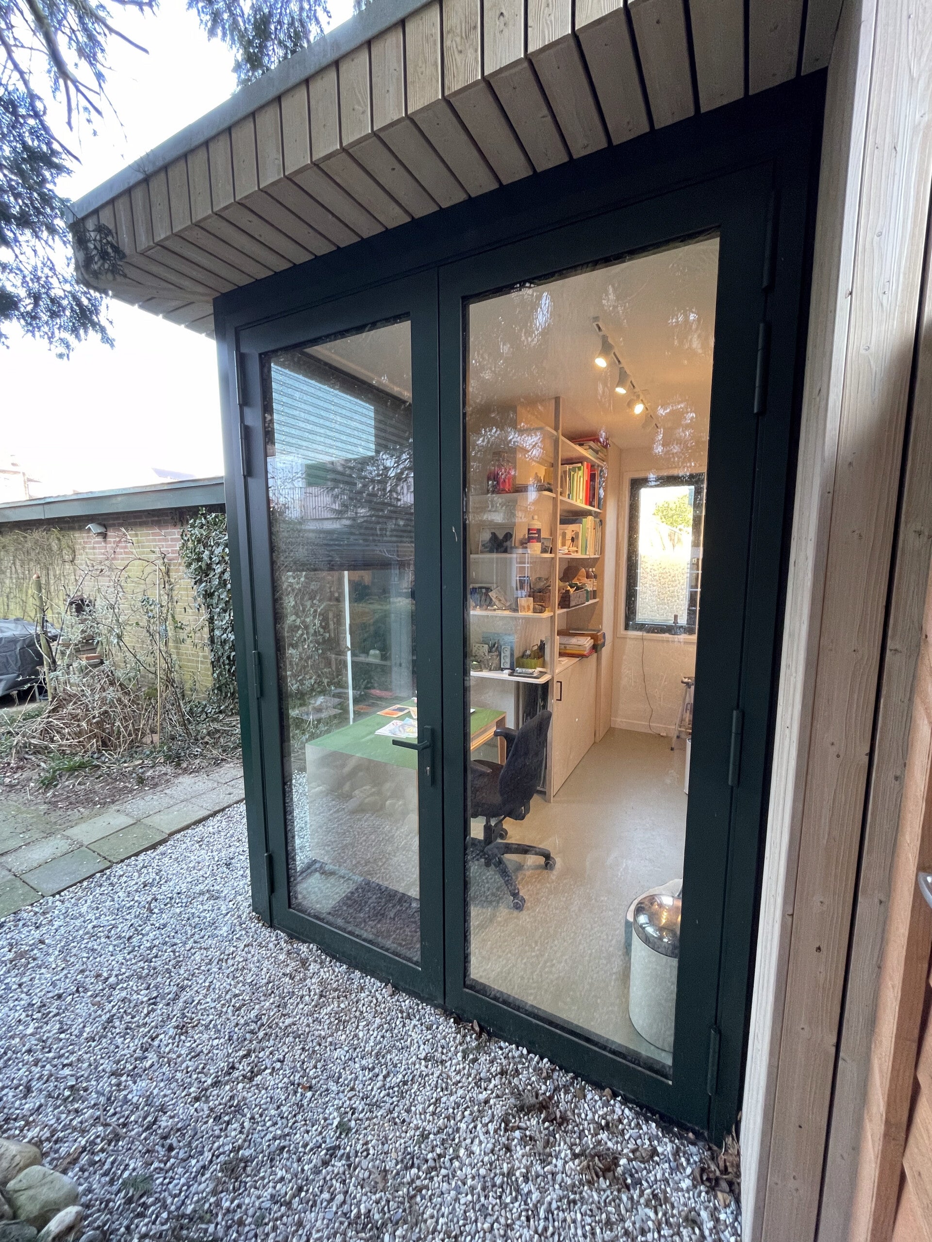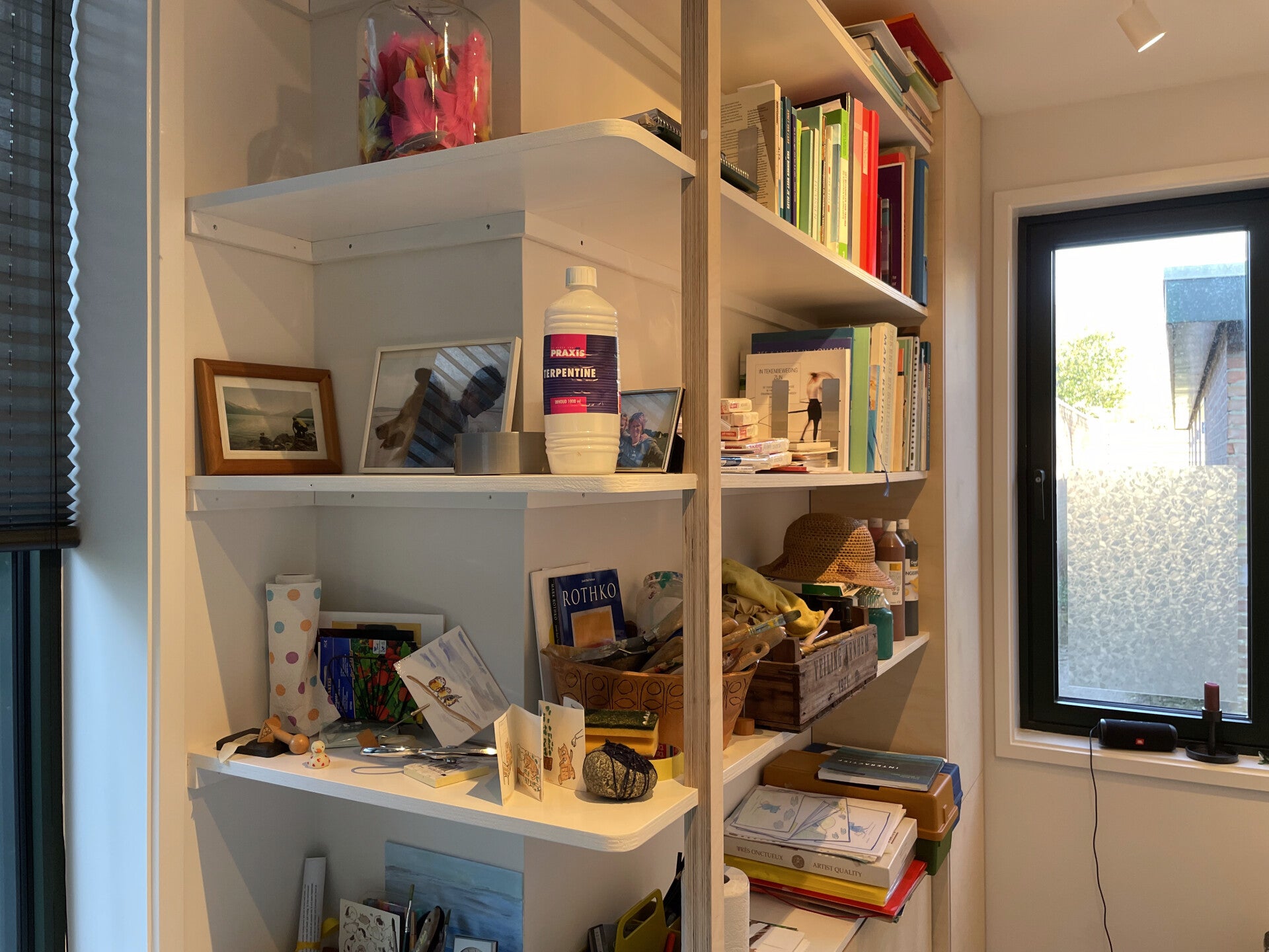 Voor een nieuw atelier ontwierp ik een verrijdbaar bureau en een slimme wandkast, beide in licht berken multiplex, het bureau met een groene HPL toplaag. Het bureau heeft doorlopende lijnen, geïntegreerde lades en open poten voor opbergruimte. De kast bevat een scharnierend deel voor tekenmappen dat ook als aflegplek dient. Zo ontstond een functionele én originele werkplek die mooi aansluit bij de tuin.