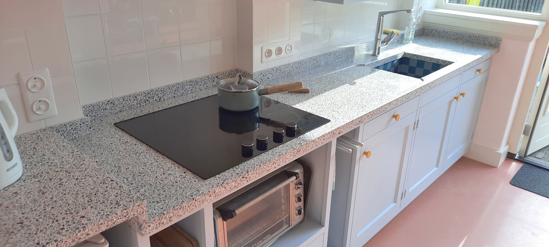 Een klant met duidelijke wensen vroeg om een speelse keuken in jaren ’20/’30-stijl, afgestemd op praktisch gebruik. Met slimme oplossingen zoals een variërend werkblad, een deels verzonken bovenkast en hergebruik van bestaande apparaten ontstond een stijlvol én functioneel geheel. Het granito blad zorgt voor veel werkruimte en samenhang. Het resultaat: precies de droomkeuken die de klant voor ogen had.